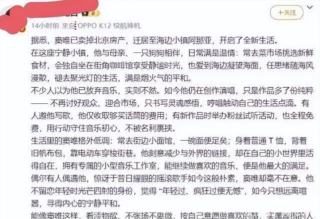 如今看他的生活态度,没有人不羡慕,在娱乐圈这个浮躁的圈子里,每个人都妄想登高峰。 却忘了停下脚步看看生活。 窦唯也给娱乐圈的人提了醒。